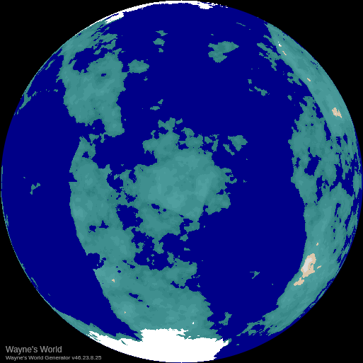 Because reasons, I became interested in trying to generate random worlds back in 1989, and I have developed numerous models for doing so since then - click here for a history of the project. My lastest version (Version 46) is showing a fair bit of promise, and I'm hopeful it will allow me to generate extremely detailed and realistic looking worlds before I'm finished. The current version generates each world from a simple character string. Click on the image below to explore Wayne's World or check out my Catalogue of Interesting Worlds