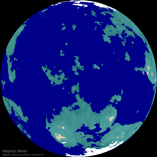 Because reasons, I became interested in trying to generate random worlds back in 1989, and I have developed numerous models for doing so since then - click here for a history of the project. My lastest version (Version 46) is showing a fair bit of promise, and I'm hopeful it will allow me to generate extremely detailed and realistic looking worlds before I'm finished. The current version generates each world from a simple character string. Click on the image below to explore Wayne's World or check out my Catalogue of Interesting Worlds